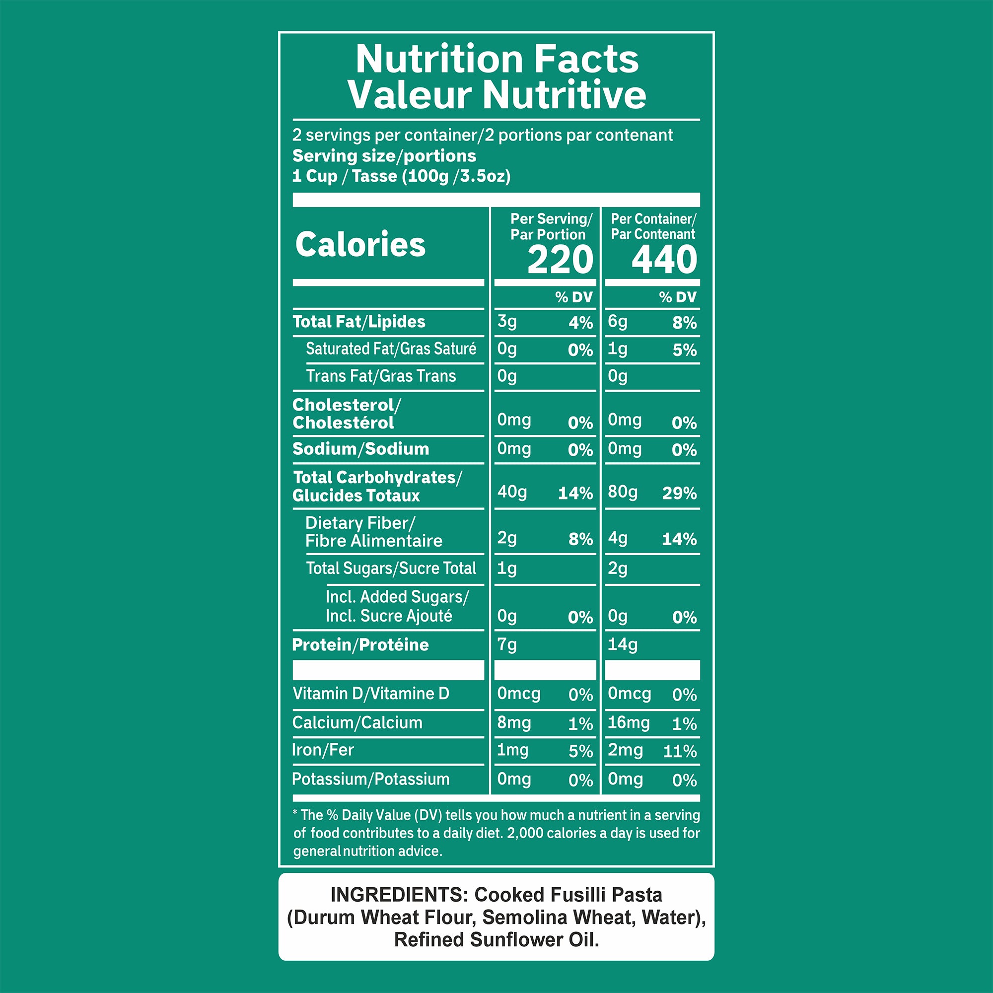 Made simply with durum wheat semolina + sunflower oil. No preservatives, no artificial colors, and absolutely 0 mg sodium.