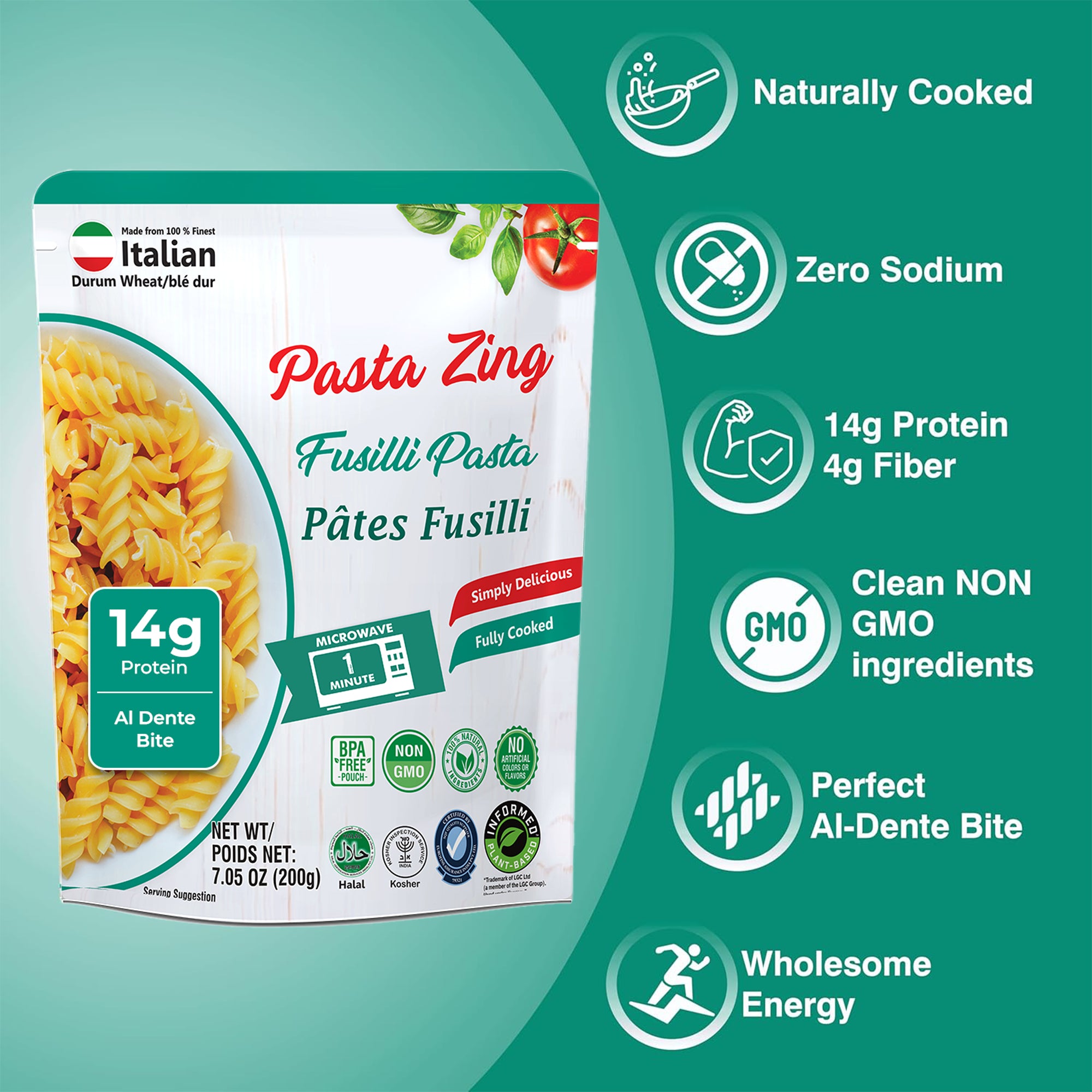 Meet the pasta that delivers restaurant-quality taste in just 1 minute. Pasta Zing Ready-to-Eat Fusilli (Rotini-Style Spirals) brings you the perfect al dente bite without boiling or draining. Naturally cooked and made from just two clean ingredients, this pasta gives you 14g protein and 4g fiber per pouch, making it a wholesome, energizing meal anytime.